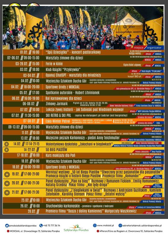 Przed nami miesiąc wypełniony koncertami, warsztatami zimowymi dla dzieci i młodzieży, feriami w kinie, spotkaniami autorskimi, wycieczkami Szlakiem Ducha Gór oraz wydarzeniami sportowymi. Luty w Szklarskiej Porębie to także 50. Bieg Piastów i liczne atrakcje towarzyszące.